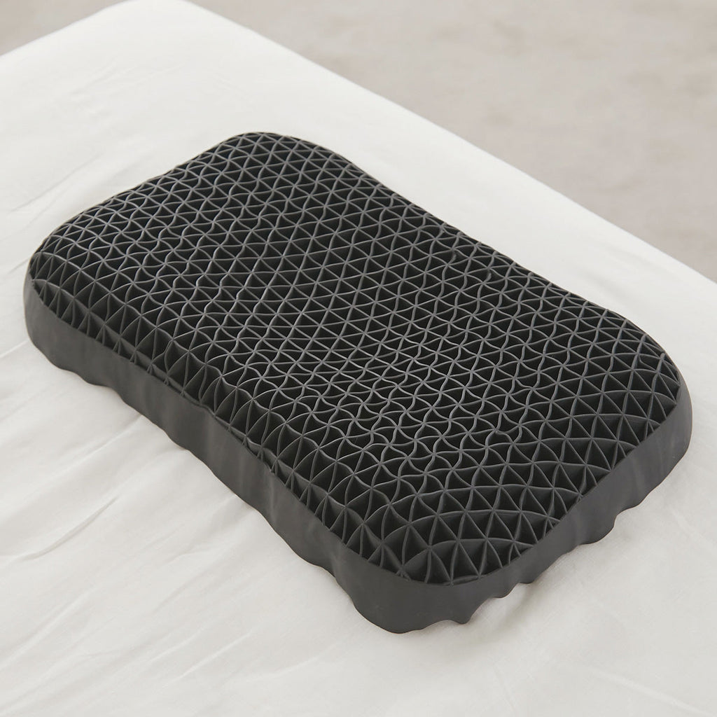 十分な柔らかさと適度な反発力を重ねた素材(TPE)が寝返りをサポート。多くの点で頭を覆うように支える三角格子構造により、負担なく流れるようにに寝返りができます。